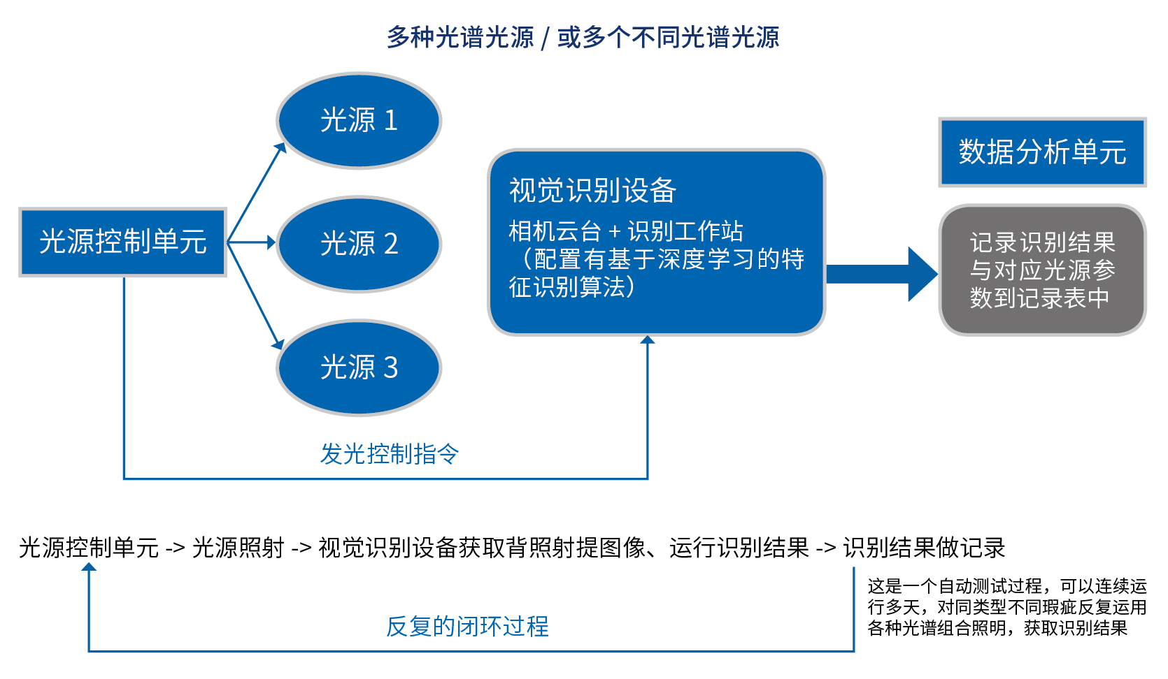 光源調(diào)整包括對(duì)同一多光譜光的不同光譜段發(fā)光控制,以及多個(gè)不同單光譜光源的順序、隨機(jī)亂序發(fā)光控制,獲取最大不同光譜照明組合數(shù)的光源照明圖像結(jié)果;經(jīng)過一段時(shí)間運(yùn)行,對(duì)所有光源照射效果的所有組合控制獲取多輪數(shù)據(jù),數(shù)據(jù)分析單元通過對(duì)識(shí)別結(jié)果記錄表的數(shù)據(jù)統(tǒng)計(jì)和分析,給出視覺場(chǎng)景的理想光源照射結(jié)果排序,以及相應(yīng)光源參數(shù)顯示。